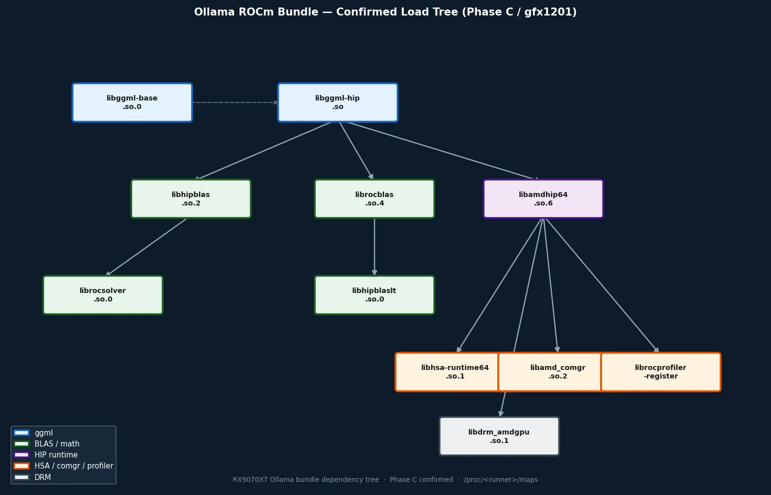 このページで得られる理解:Ollama が system ROCm とは独立した bundle-first stack で動作すること、12 ライブラリの依存チェーンが確認されていること、そして「ロードされている ≠ 使われている」という重要な区別。