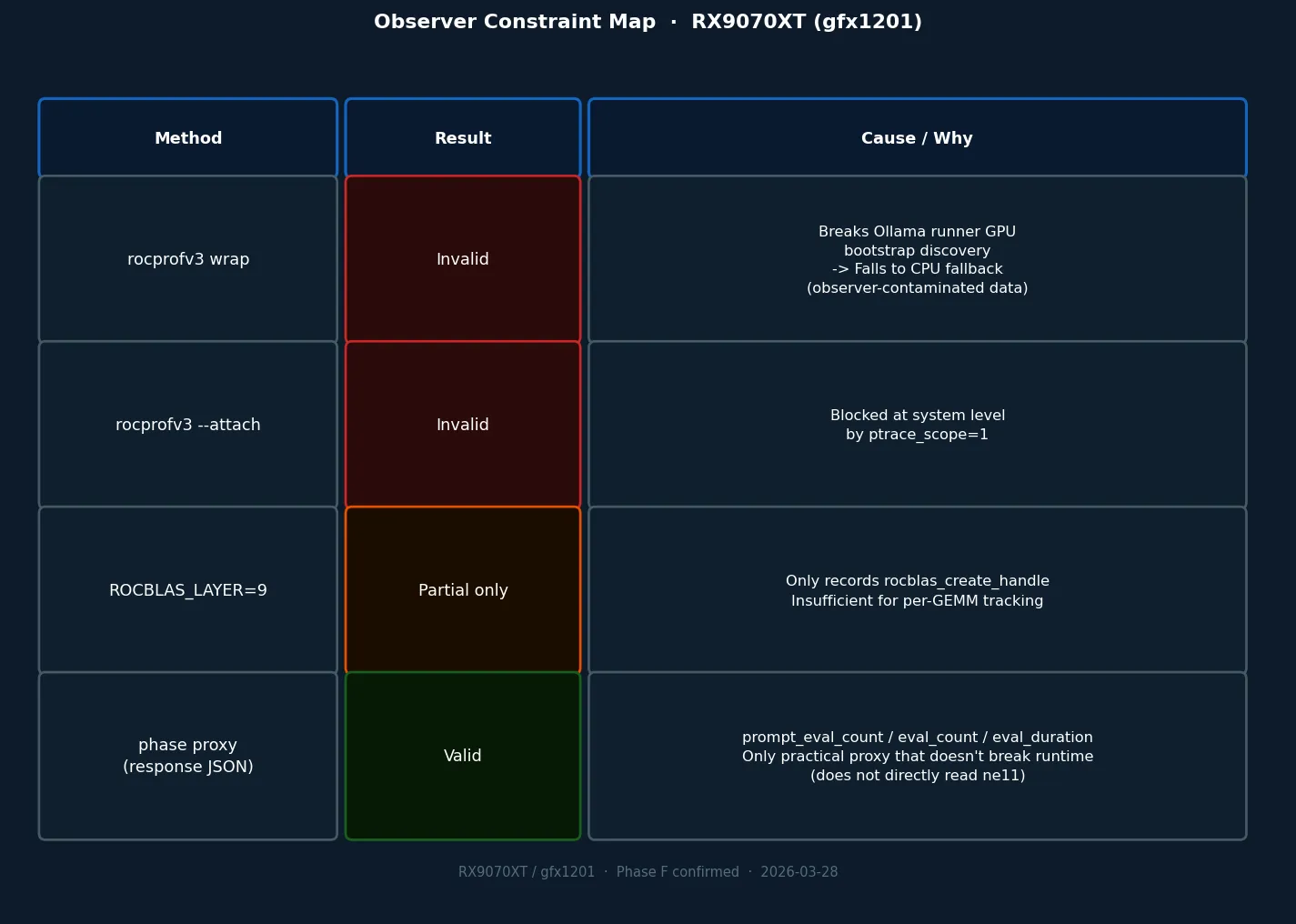 Data from this run is treated as "observation changed the situation." CPU-mode execution does not count as observing the GPU path on the RX9070XT.